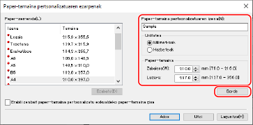 Sartu tamaina pertsonalizatuko paperaren izena eta paperaren tamaina, eta sakatu [Gorde].