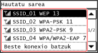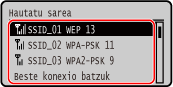 Autentifikazio- edo zifratze-metodo ezberdin bat zehazteko, erabili eskuzko konfigurazio-metodoa konektatzeko. Xehetasunak ezarriz konektatzea hari gabeko LAN batera (eskuzko konfigurazio-metodoa)