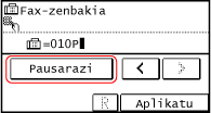 Faxa nazioarteko helmuga batera bidaltzean, sartu nazioarteko sarbide-zenbakia, herrialde-kodea eta helmugaren fax-zenbakia, ordena horretan. Sakatu [Pausarazi] zenbakien artean etenaldia gehitzeko.