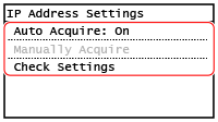 5 | Select [Manually Acquire] and press .The IP address input screen is displayed. |