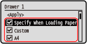 Paper sizes whose checkboxes are cleared are not displayed on the paper settings screen.