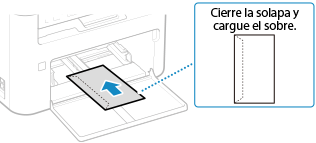 Inserte los sobres No. 10 (COM10), Monarch, ISO-C5 o DL desde el lado corto con la cara delantera (la cara sin pegamento) hacia arriba. Inserte el sobre con la solapa cerrada y en el lado izquierdo.
