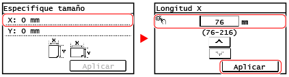 2 | Pulse [X] o [Y] para introducir la longitud y pulse [Aplicar]. ![]() Cuando se registren tamaños de papel no estándar utilizados frecuentemente, el tamaño registrado se mostrará como tamaño del papel. Registro de papel de tamaño no estándar (tamaño personalizado) |