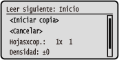 Cuando se coloca un original sobre el cristal de copia y se copia con la función de copia a dos caras o N en 1, se muestra la pantalla para escanear el siguiente original.