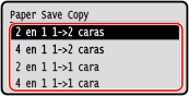 | | Si desea ahorrar papel cuando existan múltiples originales, utilice la función de copia de ahorro de papel. Podrá realizar copia N en 1 y copia a doble cara al mismo tiempo desde la pantalla [Inicio] o  en el panel de control, lo que le permitirá ahorrar papel. |