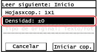 1 | Coloque el siguiente original sobre el cristal de la platina y pulse  en el panel de control. Se escaneará el siguiente original y se mostrará la misma pantalla. Repita este proceso hasta completar el escaneado de todos los originales. Podrá pulsar [Densidad] para cambiar las opciones para cada original. |