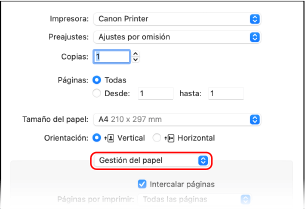 1 | En el menú emergente de opciones de impresión, seleccione [Gestión del papel]. |