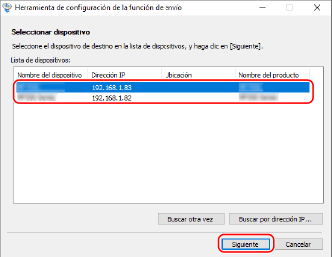En [Lista de dispositivos], seleccione el equipo y haga clic en [Siguiente].