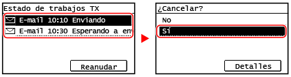 Si apareciera la pantalla de la lista de trabajos, seleccione el trabajo que desee cancelar y pulse [Sí].