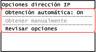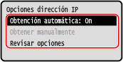 4 | Seleccione [<Aplicar>] y pulse .Aparece la pantalla [Opciones dirección IP]. |