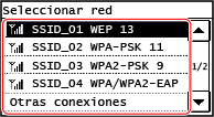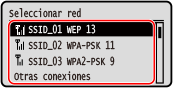 Busque un router de LAN inalámbrica (punto de acceso) al que desee conectarse e introduzca la clave de red. Al conectar con el método de configuración del punto de acceso, se establecen los siguientes métodos de autenticación y cifrado: Método de autenticación WEP: sistema abierto Cifrado WPA/WPA2: se establece automáticamente la opción AES-CCMP o TKIP según el router de LAN inalámbrica que se seleccione. Para especificar otro método de autenticación o cifrado, utilice el método de configuración manual para establecer la conexión. Conexión a una LAN inalámbrica mediante la configuración de los detalles (método de configuración manual) |