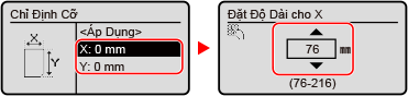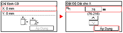 2 | Nhấn [X] hoặc [Y] để nhập chiều dài và nhấn [Áp Dụng]. Khi các khổ giấy không chuẩn thường sử dụng được đăng ký, khổ giấy đã đăng ký được hiển thị như khổ giấy. Đăng Ký Giấy Khổ Không Chuẩn (Giấy Tùy Chỉnh) |