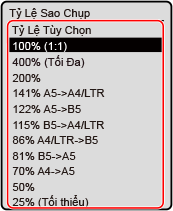 Chọn tỷ lệ sao chụp cố định từ danh sách hoặc chọn [Tỷ Lệ Tùy Chọn] và nhập tỷ lệ tuỳ chỉnh bằng cách sử dụng các phím số.