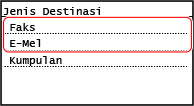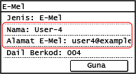 Untuk maklumat destinasi, tekan [Alamat E-Mel] atau [Nombor Faks], masukkan maklumat itu dan kemudian tekan [Guna].
