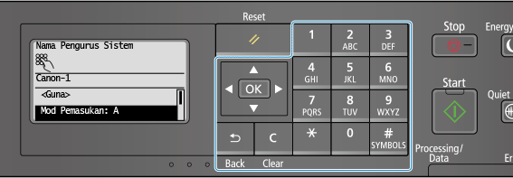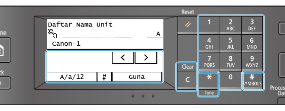 Masukkan aksara abjad angka menggunakan kekunci angka pada panel kawalan.