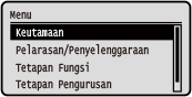 Menukar Paparan SkrinAnda boleh menukar paparan panel kawalan seperti dengan menukar bahasa paparan dan unit, dan tunjukkan atau sembunyikan mesej. [Tetapan Paparan] Anda boleh menyongsangkan warna skrin dan melaraskan kontras untuk menjadikan skrin lebih mudah dilihat. [Kebolehcapaian] Mengosongkan Tetapan Secara AutomatikSecara lalai, jika tiada operasi dijalankan selepas tempoh masa tertentu, tetapan yang dikonfigurasi pada skrin akan dikosongkan, dan skrin [Rumah] dipaparkan. Anda boleh menukar masa hingga tetapan ini dikosongkan dan skrin yang dipaparkan selepasnya. [Masa Set Semula Auto] [Fungsi Selepas Set Semula Auto] |