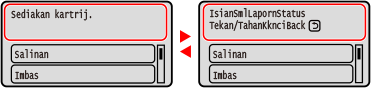Apabila Mesej Muncul di Bawah Skrin Sekiranya mesej terlalu panjang untuk dipaparkan sekaligus, ia mungkin dipisahkan menjadi segmen lebih kecil dan dipaparkan secara bergilir-gilir. Model panel sentuhan ![]() Apabila [ ] dipaparkan pada bahagian atas skrin, anda boleh menekan [ ] untuk memaparkan dan menyemak pemberitahuan.Model LCD 5 Baris ![]() |