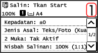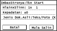 2 | Pilih [<Mula Menyalin>] tekan  . Dokumen asal yang diimbas dicetak. |
