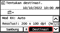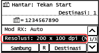Menentukan DestinasiMasukkan nombor faks dengan kekunci angka atau pilih destinasi yang didaftarkan dalam Buku Alamat dengan menekan [Destinasi].