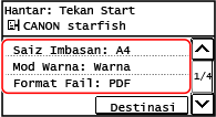 Mendaftarkan Tetapan Imbasan Yang Kerap Digunakan sebagai Tetapan LalaiAnda boleh menukar tetapan imbasan lalai mengikut tetapan imbas yang kerap digunakan. Menukar Tetapan LalaiMemanggil Semula Tetapan Yang Lalu - Log Kerja TXAnda boleh menggunakan Log Kerja TX untuk memanggil semula tetapan imbasan yang digunakan untuk menghantar atau simpan data yang diimbas pada masa lalu. Menentukan Destinasi (Log Kerja TX) |