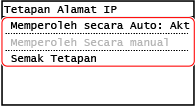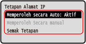 2 | Konfigurasikan tetapan Peroleh Secara Auto, sebagaimana yang diperlukan. [Pilih Protokol] Biasanya, ditetapkan kepada [DHCP]. Namun, apabila [DHCP] ditetapkan dalam persekitaran DHCP tidak dapat digunakan, mesin akan terus mengesahkan Peroleh Secara Auto dalam rangkaian, mewujudkan komunikasi yang tidak perlu. Apabila tidak menggunakan DHCP, tetapkan ini kepada [Tak Aktif]. [IP Auto] Biasanya, ditetapkan kepada [Aktif]. Walaupun keutamaan diberikan kepada alamat IP yang diperuntukkan dengan DHCP, tetapi jika tidak ada respon daripada DHCP, Auto IP akan digunakan. |