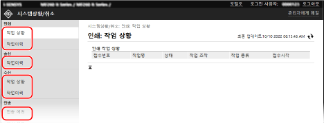 시스템 관리자 모드를 사용하여 리모트 UI에 로그인하면 모든 인쇄 작업의 상태가 표시됩니다.