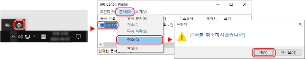 위의 화면이 표시되지 않으면 Windows 알림 영역에서 프린터 아이콘을 두 번 클릭하고, 취소할 문서를 선택한 다음, [문서]