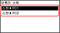 [스캔 -> PC1] 또는 [스캔 -> PC2]를 선택합니다.