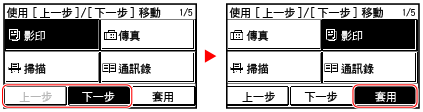 按下 [上一步] 或 [下一步] 以移動按鈕。