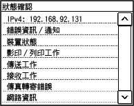 時會顯示此畫面。此畫面可用來檢查本機資訊、使用情況和記錄、網路設定和錯誤資訊。