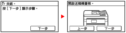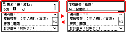 發生錯誤而且本機的紙張或碳粉匣中的碳粉用完時,畫面會顯示訊息。