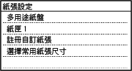在 [首頁] 畫面中按下 [紙張設定] 時會顯示此畫面。此畫面可用來指定本機的各種設定。