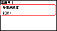 紙張設定畫面會顯示註冊的常用紙張尺寸。如果顯示未使用的紙張尺寸,您可以對於各個紙張來源隱藏這些尺寸,以便更容易選擇紙張尺寸。