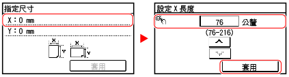 2 | 按下 [X] 或 [Y] 輸入長度,然後按下 [套用]。 當註冊常用的非標準紙張尺寸時,註冊的尺寸會顯示為紙張尺寸。 註冊非標準尺寸紙張(自訂紙張) |