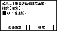 當 [通知檢查紙張設定] 設定 [開啟] 時,會顯示如上畫面。如果您要變更設定,請從 [紙張設定] 開始。
