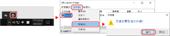 如未會顯示上述畫面,請按兩下 Windows 通知區域中的印表機圖示,選擇要取消的文件,然後按一下 [文件]