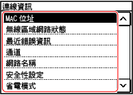 使用 [狀態確認] 畫面檢視資訊您也可以透過下列程序檢視無線區域網路狀態和錯誤資訊: 控制面板上的  [網路資訊]  [網路連線方法]  [連線資訊]。 |