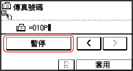 向國際目的地傳送傳真時,請依序輸入目的地的國際冠碼、國碼和傳真號碼。在各號碼之間按下 [暫停] 以新增暫停。