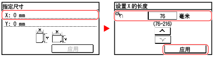 2 | 按 [X] 或 [Y] 输入长度,然后按 [应用]。 ![]() 注册常用非标准纸张尺寸后,注册的尺寸将显示为纸张尺寸。注册非标准尺寸纸张(自定义纸张) |