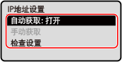 2 | 根据需要配置“自动获取”设置。 [选择通信协议] 通常设为 [DHCP] 即可。但是,如果在无法使用 DHCP 的环境中设为 [DHCP],本机将继续在网络中确认“自动获取”,从而产生不必要的通信。不使用 DHCP 时,请将其设为 [关闭]。 [自动获取IP] 通常设为 [打开] 即可。虽然使用 DHCP 分配的 IP 地址具有优先级,但如果 DHCP 没有响应,将使用 Auto IP。 |