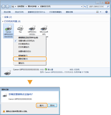删除不需要的打印机图标完成安装网络打印机后,就不再需要安装打印机驱动程序步骤 13 中添加的图标。要删除图标,请右键单击图标并选择 [删除设备] 或 [删除]