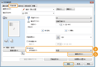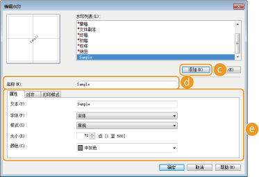单击各选项卡指定水印名称的文本、颜色或打印位置。更多设置信息,请单击打印机驱动程序画面上的 [帮助]。