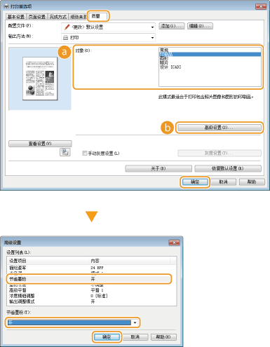 可以指定是否为各文档类型启用墨粉节约设置。为 [对象] 中列出的各文档类型指定墨粉节约设置。