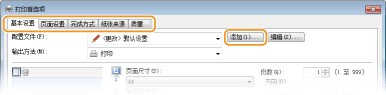 可根据需要在 [基本设置]、[页面设置]、[完成方式]、[纸张来源] 和 [质量] 选项卡上进行打印设置。