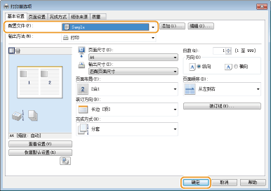 每次打印时指定“在 A4 尺寸纸张上单面横向墨粉节省模式”等设置组合会比较耗时。如果将常用的打印设置组合注册为“配置文件”,则只需从列表中选择配置文件即可指定打印设置。本节旨在说明如何注册配置文件以及如何使用配置文件进行打印。