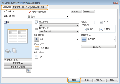 可根据需要在 [基本设置]、[页面设置]、[完成方式]、[纸张来源] 和 [质量] 选项卡上进行打印设置。