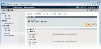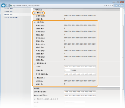 通过远程用户界面设置 IPv6 地址。设置 IPv6 地址前,请确保已正确设置 IPv4 地址(查看网络设置)。您最多可注册 9 个如下文所示的 IPv6 地址。