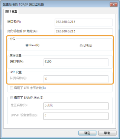 在 [协议类型] 下选择 [RAW] 或 [LPR],并更改 [端口号]。
