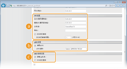 mDNS(多路传送 DNS)被 Bonjour 等服务采用,是一种不用 DNS 进行主机名与 IP 地址关联的协议。勾选该复选框启用 mDNS,并在 [mDNS名称:] 文本框中输入 mDNS 名称。如果不想使用 mDNS,请取消勾选该复选框。 [DHCP选项设置][获取主机名:]