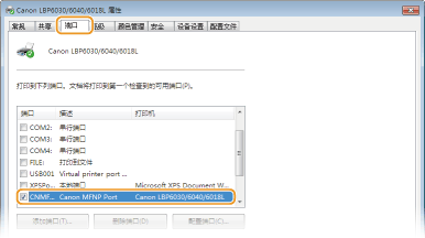 如果所选端口的 [说明] 为 [Canon MFNP 端口],并且本机与计算机位于同一子网中,则将保持连接。您无需添加新端口。如果端口为 [标准 TCP/IP 端口],则需要添加新端口。 配置打印机端口